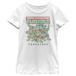 - Strut your stuff with this stylish new Girls’ Graphic T-Shirt that is perfect for every occasion! Featuring Donatello, Leonardo, Michelangelo, and Raphael with the word: “Cowabunga,” at the bottom.
