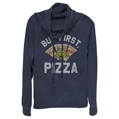 - Strut your stuff with this stylish new juniors’ cowl neck sweatshirt that is perfect for every occasion! Featuring Michelangelo smiling face and his favorite food along with the phrase: “But first, pizza” printed in distressed white letters across the front.