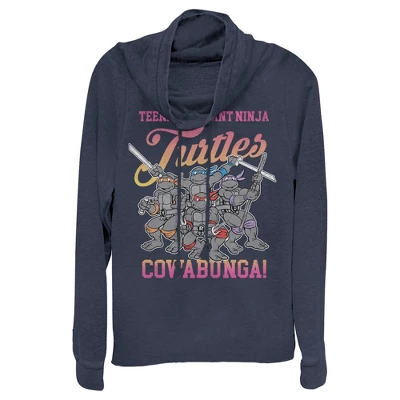 - Strut your stuff with this stylish new juniors’ cowl neck sweatshirt that is perfect for every occasion! Featuring Donatello, Michelangelo, Raphael, and Leonardo in cool poses and “Cowabunga!” printed in colorful letters that fade from yellow to pink.