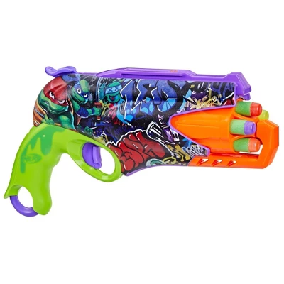 - NERF TEENAGE MUTANT TURTLES BLASTER: Cowabunga! Unleash mutant mayhem with this blaster that features epic Teenage Mutant Ninja Turtles designs on both sides